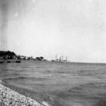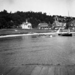 - View of Mackinac Island shoreline, boats, houses, taken from a dock on the island, by the Leopold family, ca. 1900-09.