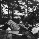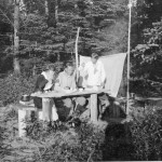 - Aldo’s sister, Marie Leopold and others at picnic table in camp, Les Cheneaux, ca. 1909-19.